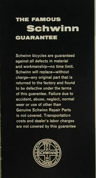 Schwinn bicycles are guaranteed against all defects in material and workmanship-no time limit. Schwinn will replace-without charge-any original part that is returned to the factory and found to be defective under the terms of this guarantee.